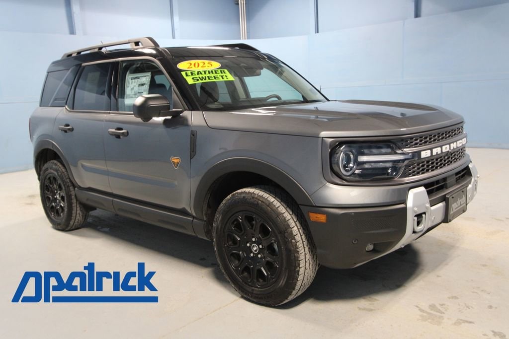 2025 Ford Bronco Sport Badlands We want you to shop confidently for your next used car at The BIG Ford Store, D-Patrick Ford. We are located on Highway 41 and Walnut in Evansville, right next to the Lloyd Expressway. Buy this used vehicle 100% online or in-store. This pre-owned vehicle was put through an extensive inspection before hitting our lot. Because of this, we are able to offer a 3-month/3,000-mile comprehensive limited warranty. You also get our Love It or Return It 5-day, 300-mile Exchange Policy. See our website for more details on both. We also offer extended service plans, vehicle protection plans, and offer a CarFax vehicle history report. *Prices listed do not include a $250 documentation fee, applicable tax, title, tags, license, or $195 service and preparation. All pricing, vehicle information, and features (such as accessories and color) are believed to be accurate, but we do not warrant or guarantee such accuracy. The prices shown above may vary from region to region, and incentives are subject to change. Some offers listed may not be available to all customers. All online sale commitments are subject to confirmation of continued availability of vehicle. Once availability is confirmed, online sale agreement becomes binding upon the parties. If any information found on the website is thought to be erroneous, please verify information with a customer service representative. See dealer for full details. Looking to sell your current vehicle? We buy cars for cash. Every test drive at D-Patrick Ford in Evansville earns $10 to a local charity. Schedule your test drive today! 4-Wheel Disc Brakes, 6 Speakers, ABS brakes, Air Conditioning, Alloy wheels, AM/FM radio: SiriusXM, AM/FM Stereo, Auto High-beam Headlights, Auto-dimming Rear-View mirror, Automatic temperature control, Brake assist, Compass, Delay-off headlights, Driver door bin, Driver vanity mirror, Dual front impact airbags, Dual front side impact airbags, Electronic Stability Control, Emergency communication system: SYNC 4 911 Assist, Equipment Group 400A, Four wheel independent suspension, Front anti-roll bar, Front Bucket Seats, Front Center Armrest, Front fog lights, Front License Plate Bracket, Front reading lights, Fully automatic headlights, Garage door transmitter, Heated door mirrors, Heated front seats, Heated steering wheel, Illuminated entry, Knee airbag, Leather Trimmed Front Bucket Seats, Low tire pressure warning, Memory seat, Occupant sensing airbag, Outside temperature display, Overhead airbag, Overhead console, Panic alarm, Passenger door bin, Passenger vanity mirror, Power door mirrors, Power driver seat, Power passenger seat, Power steering, Power windows, Radio data system, Rear anti-roll bar, Rear reading lights, Rear seat center armrest, Rear window defroster, Rear window wiper, Remote keyless entry, Security system, SiriusXM, Speed control, Speed-sensing steering, Speed-Sensitive Wipers, Split folding rear seat, Steering wheel mounted audio controls, SYNC 4 w/Enhanced Voice Recognition, Tachometer, Telescoping steering wheel, Tilt steering wheel, Traction control, Trip computer, Variably intermittent wipers, Wheels: 17 Matte Black-Painted Aluminum. CARFAX One-Owner. Clean CARFAX. 4D Sport Utility Badlands 8-Speed Automatic EcoBoost 2.0L I4 GTDi DOHC Turbocharged VCT 4WD Gray Metallic CALL TODAY (812) 625-4823 OR SHOP ONLINE AT WWW.DPATRICKFORD.COM.