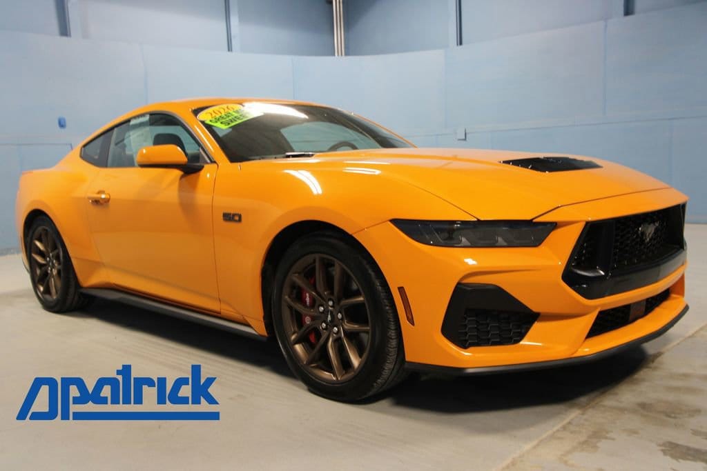 2026 Ford Mustang GT We want you to shop confidently for your next used car at The BIG Ford Store, D-Patrick Ford. We are located on Highway 41 and Walnut in Evansville, right next to the Lloyd Expressway. Buy this used vehicle 100% online or in-store. This pre-owned vehicle was put through an extensive inspection before hitting our lot. Because of this, we are able to offer a 3-month/3,000-mile comprehensive limited warranty. You also get our Love It or Return It 5-day, 300-mile Exchange Policy. See our website for more details on both. We also offer extended service plans, vehicle protection plans, and offer a CarFax vehicle history report. *Prices listed do not include a $250 documentation fee, applicable tax, title, tags, license, or $195 service and preparation. All pricing, vehicle information, and features (such as accessories and color) are believed to be accurate, but we do not warrant or guarantee such accuracy. The prices shown above may vary from region to region, and incentives are subject to change. Some offers listed may not be available to all customers. All online sale commitments are subject to confirmation of continued availability of vehicle. Once availability is confirmed, online sale agreement becomes binding upon the parties. If any information found on the website is thought to be erroneous, please verify information with a customer service representative. See dealer for full details. Looking to sell your current vehicle? We buy cars for cash. Every test drive at D-Patrick Ford in Evansville earns $10 to a local charity. Schedule your test drive today! 3.55 Limited Slip Rear Axle, 4-Wheel Disc Brakes, ABS brakes, Air Conditioning, Alloy wheels, AM/FM Stereo, Auto High-beam Headlights, Automatic temperature control, Black Painted Wedge Decklid Spoiler, Brake assist, Brembo Brake System with Performance Linings, Bronze Appearance Package, Bumpers: body-color, Cloth Bucket Seats, Compass, Delay-off headlights, Driver door bin, Driver vanity mirror, Dual front impact airbags, Dual front side impact airbags, Electronic Stability Control, Emergency communication system: 911 Assist, Equipment Group 300A Standard Package, Exterior Parking Camera Rear, Four wheel independent suspension, Front anti-roll bar, Front Bucket Seats, Front Center Armrest, Front dual zone A/C, Front reading lights, Fully automatic headlights, Illuminated entry, International Orange Seat Belt, Knee airbag, Leather Shift Knob, Leather steering wheel, Low tire pressure warning, Occupant sensing airbag, Outside temperature display, Overhead airbag, Overhead console, Panic alarm, Passenger door bin, Passenger vanity mirror, Power door mirrors, Power steering, Power windows, Radio data system, Rain sensing wipers, Rear anti-roll bar, Rear Parking Sensors, Rear window defroster, Red Painted Brake Calipers with White Logo, Remote keyless entry, Speed control, Speed-sensing steering, Speed-Sensitive Wipers, Split folding rear seat, Sport steering wheel, Steering wheel mounted audio controls, SYNC 4, Tachometer, Telescoping steering wheel, Tilt steering wheel, Traction control, Trip computer, Variably intermittent wipers, Voltmeter, Wedge Decklid Spoiler. CARFAX One-Owner. Clean CARFAX. 2D Coupe GT 6-Speed Manual 5.0L V8 Ti-VCT RWD Orange Fury Metallic Tri-Coat CALL TODAY (812) 625-4823 OR SHOP ONLINE AT WWW.DPATRICKFORD.COM.